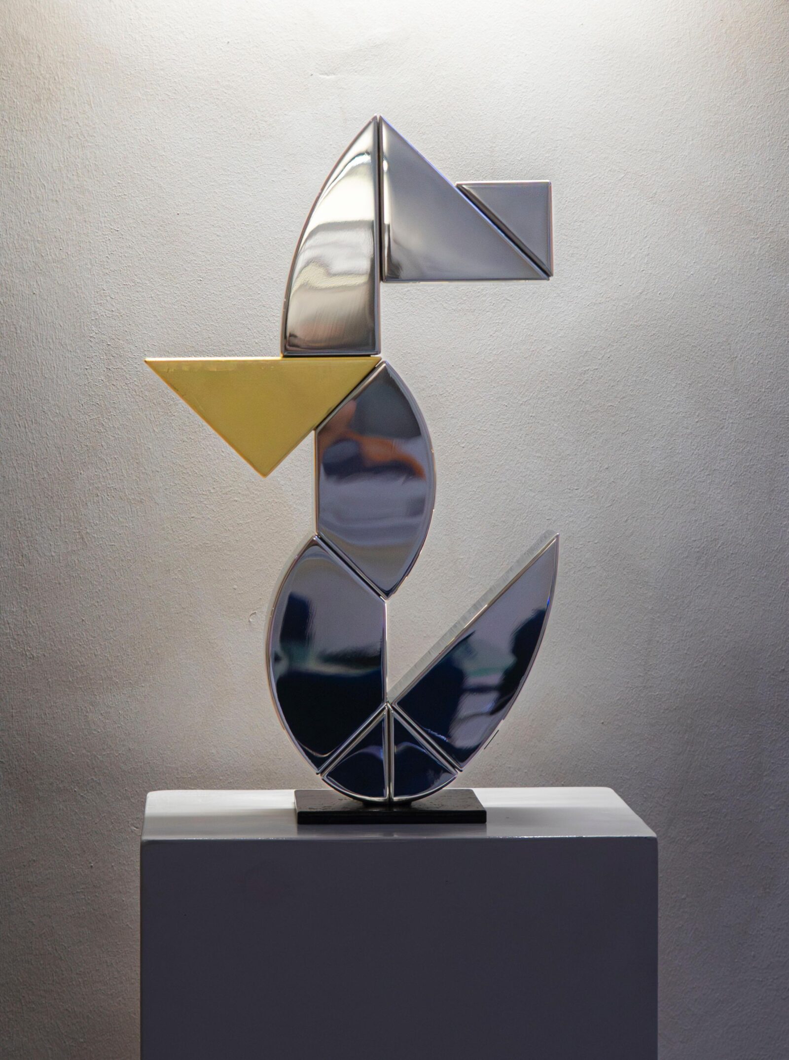 Ancilotto lavora da anni su una poetica della modularità e della reversibilità. La forma non è mai definitiva, ma si offre come processo, possibilità, costruzione aperta. La scelta dell’acciaio – un materiale industriale, lucido, a suo modo inospitale – viene riequilibrata dalla presenza dell’oro, che introduce una dimensione simbolica più antica, quasi sacrale. L’effetto complessivo è quello di una scultura che non pretende di imporsi, ma che esige uno sguardo attivo, capace di coglierne il carattere dinamico.