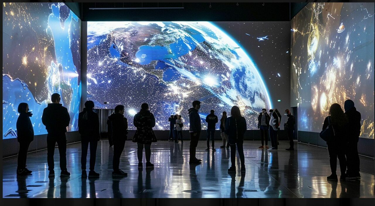 Il cuore del percorso è un imponente ledwall curvo, lungo oltre 40 metri, che accoglie il visitatore con un’imagerie di rara suggestione: la Terra vista dall’alto, non come una mappa astratta ma come superficie vivente. In queste immagini, tratte in gran parte dal programma Copernicus, si osservano le dinamiche del cambiamento climatico, le aree soggette a deforestazione massiva, la progressiva scomparsa dei ghiacciai, l’espansione di metropoli luminose che divorano il buio notturno. Il satellite qui è più di uno strumento di sorveglianza: è uno specchio critico, una sonda etica, un occhio che misura la distanza tra ciò che siamo e ciò che potremmo essere.