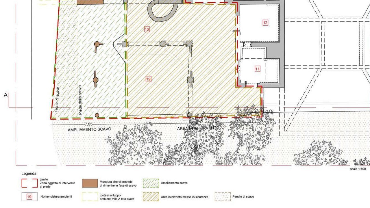 Il cantiere nasce dall’esigenza di chiarire aspetti ancora incerti relativi allo sviluppo planimetrico di questa porzione della villa, oltre che di affrontare alcune criticità conservative emerse nel tempo. Lo scavo, avviato di recente, sta restituendo risultati di grande interesse: nuovi scorci di affreschi di eccezionale raffinatezza, caratterizzati da una vivace resa cromatica e da un repertorio figurativo di straordinaria complessità, stanno emergendo progressivamente dalle stratigrafie. Tra questi spiccano le raffigurazioni di pavoni, simboli di lusso e prestigio, e maschere teatrali inserite in un articolato programma decorativo.