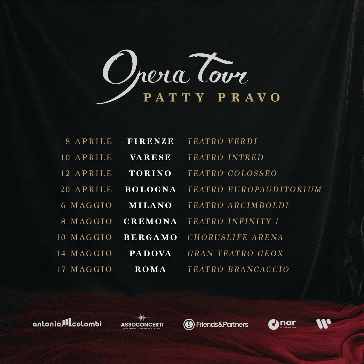 Dopo l’annuncio della sua partecipazione alla 76ª edizione del Festival di Sanremo, Patty Pravo apre ufficialmente un nuovo capitolo della sua carriera dal vivo. A partire dall’8 aprile 2026, l’artista sarà protagonista nei principali teatri italiani con l’attesissimo “Opera Tour”, una tournée che prende il nome dal brano con cui salirà sul palco dell’Ariston.