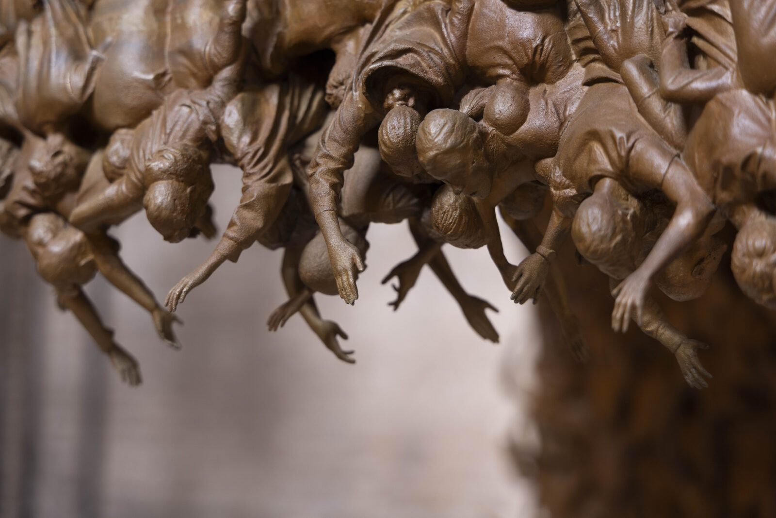 L’allestimento gioca un ruolo fondamentale nel valorizzare questa dialettica tra scultura e ambiente circostante. Le opere sono disposte in modo da rispettare la sacralità storica dello spazio, ma al contempo far emergere la vitalità delle forme di Cragg, che si collocano come presenze organiche tra le pietre. L’illuminazione è calibrata con precisione: la luce morbida e indiretta attraversa le superfici delle sculture, ora lucide e riflettenti, ora opache e stratificate, accentuando l’effetto di movimento e trasformazione. Questo gioco di ombre e luci crea un effetto visivo che arricchisce l’esperienza del visitatore, facendo apparire le sculture mutevoli, quasi eteree, come se fossero flussi di energia congelati nel momento del loro massimo vigore. Cragg si distingue per il suo uso di materiali plastici e metallici riciclati, che vengono reinterpretati con attenzione sia alla composizione visiva che al significato intrinseco della materia stessa.