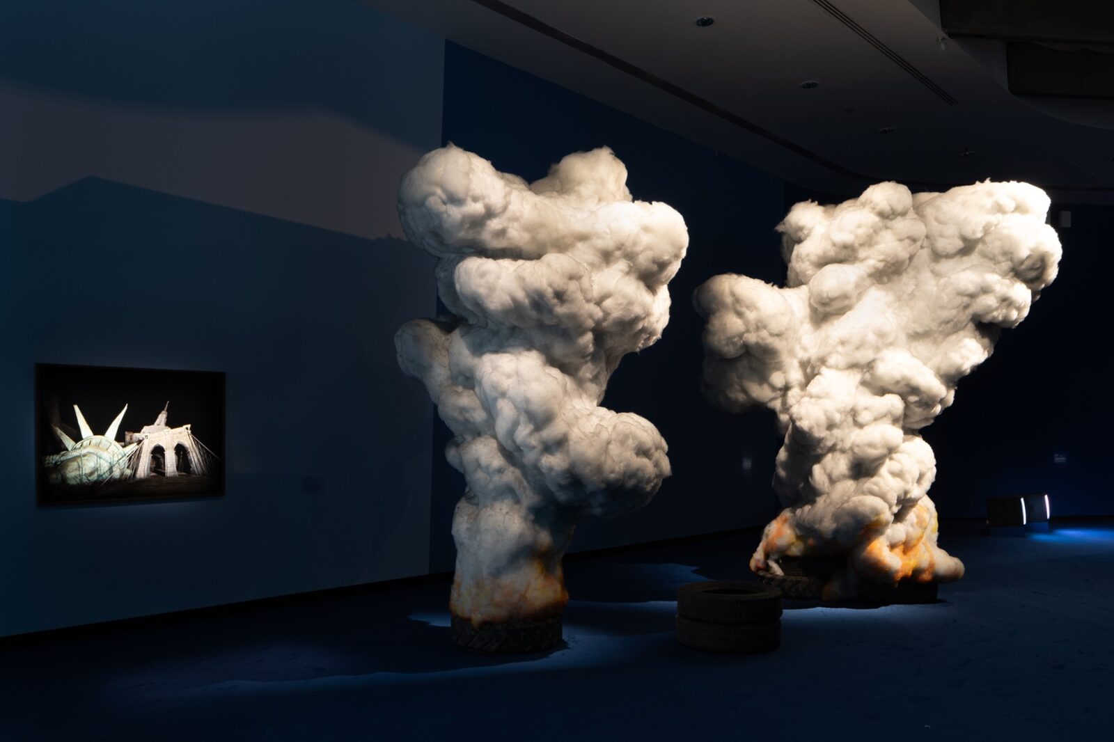 Ogni opera è collocata con precisione chirurgica, in dialogo con lo spazio e le altre opere. For the Benefit of All the Races of Mankind di Kara Walker irrompe nella narrazione con una forza iconografica dirompente, affrontando il tema del razzismo con immagini crude e incisive che si fissano nella memoria dello spettatore. A sua volta, Fire Tires di Gal Weinstein congela un momento di violenza in una struttura molecolare che diventa simbolo di trasformazione e resilienza. L’arte qui non è oggetto da contemplare passivamente, ma dispositivo attivo, capace di generare domande e tensioni, di creare un campo di forze che coinvolge lo spettatore.